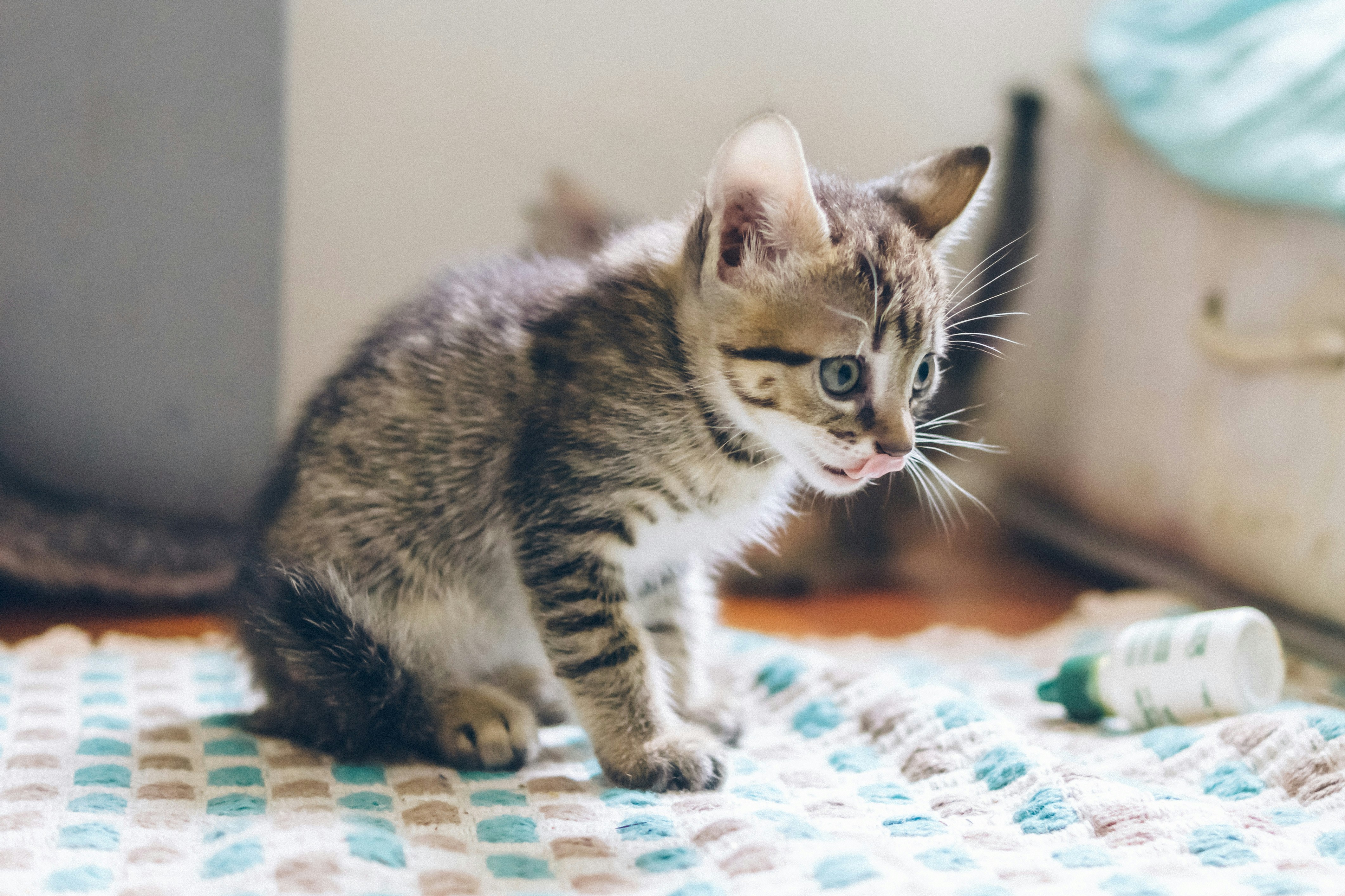 Small, grey tabby kitten lies.